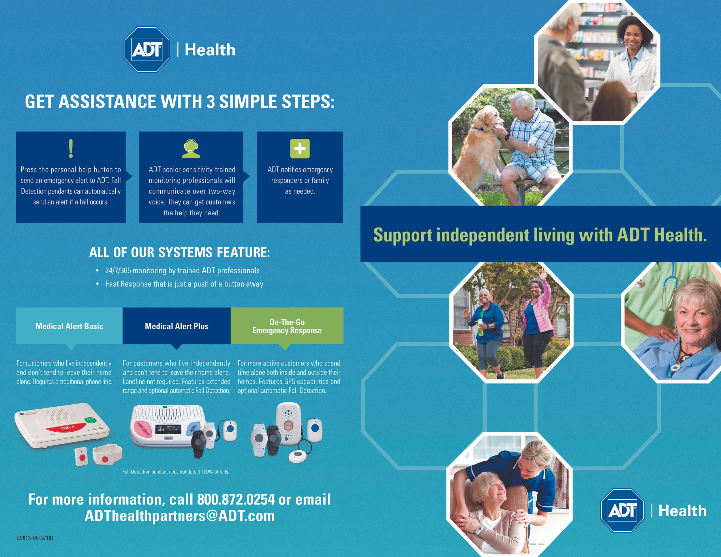 Below is another marketing brochure for ADT Health targeted towards seniors. This trifold details the benefits of why someone should choose ADT Health. The look and feel is on-brand and consistent with existing ADT Health pieces.