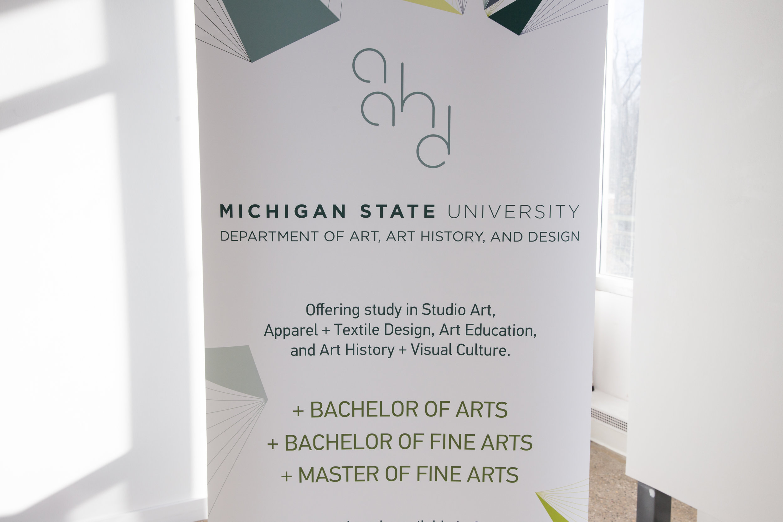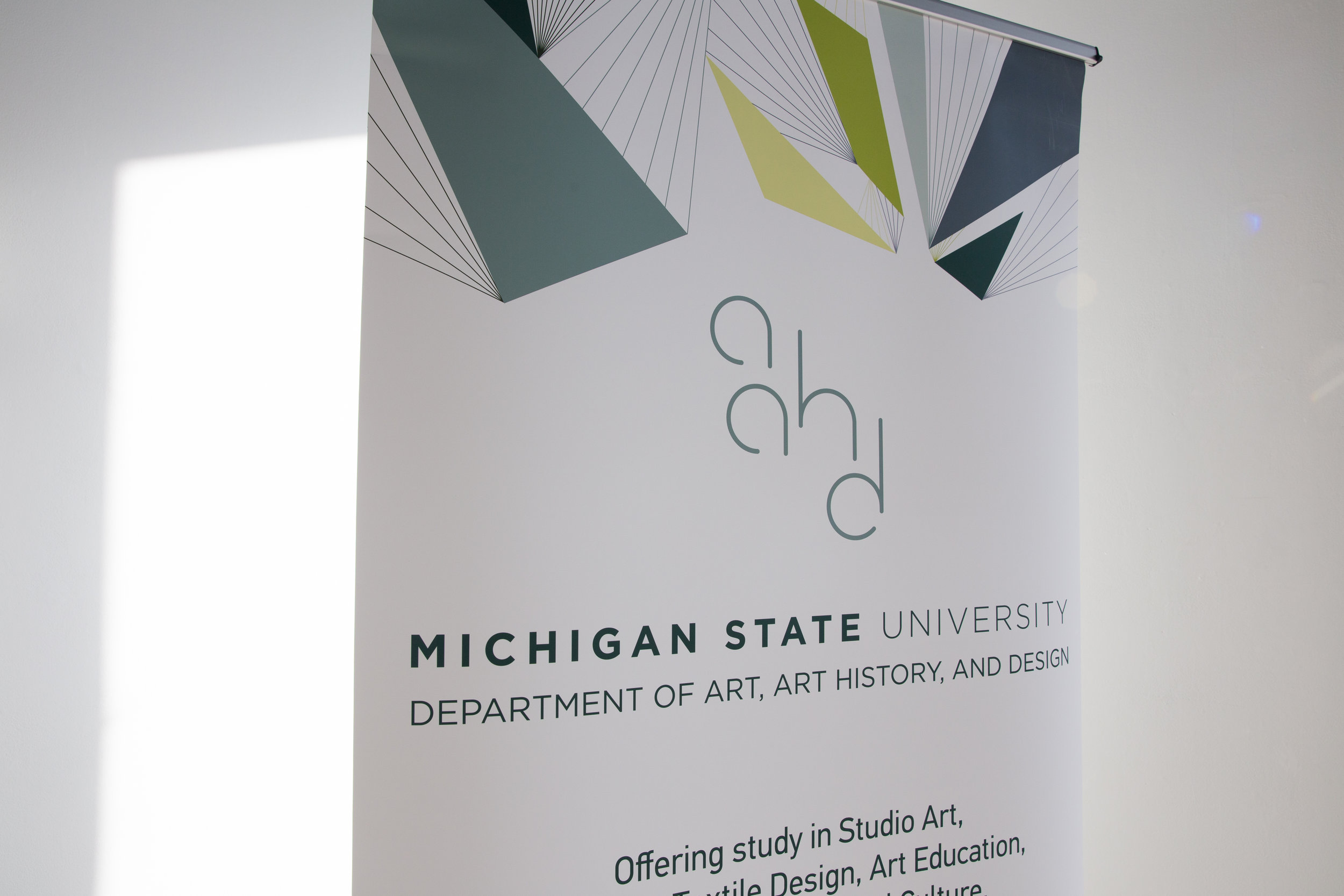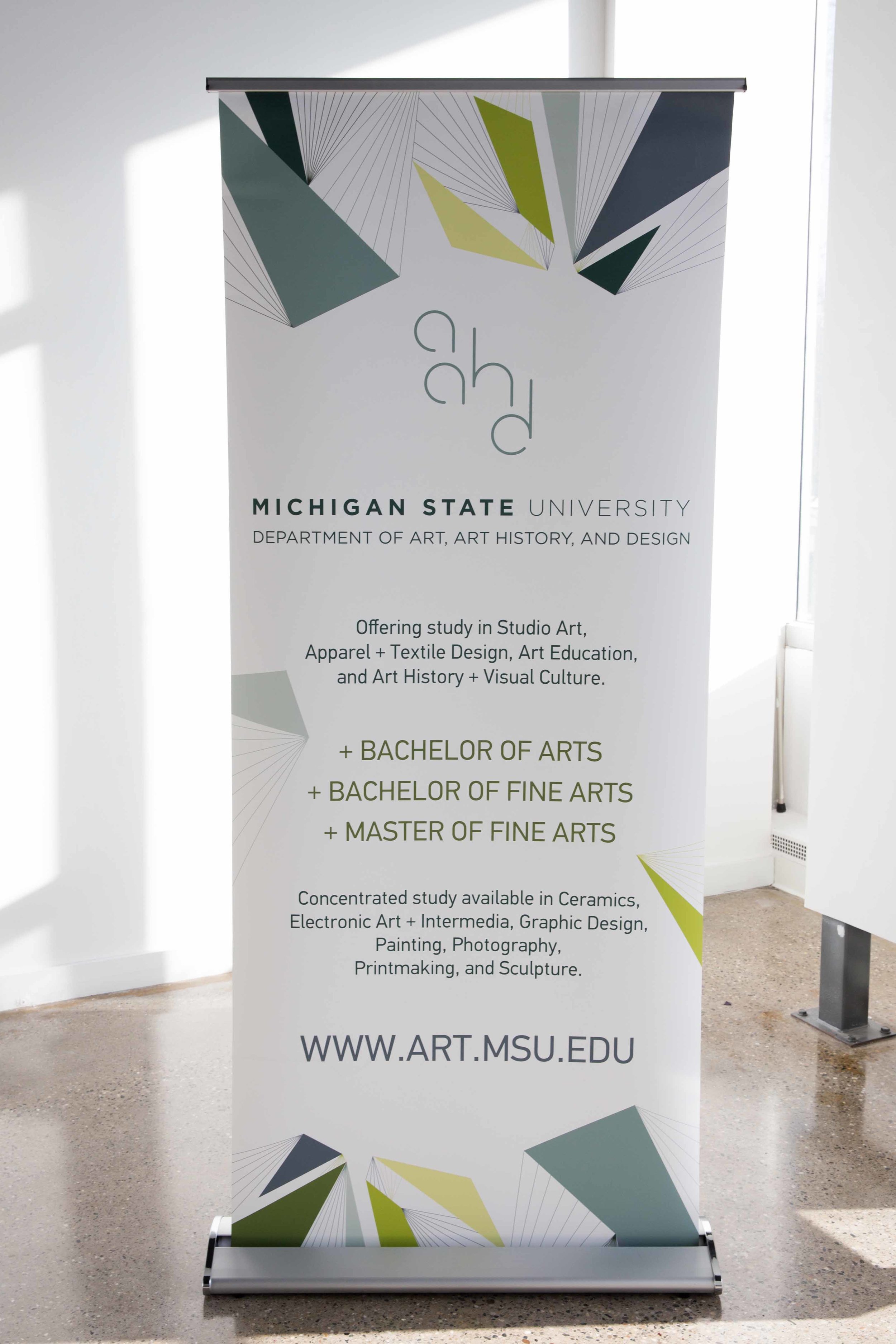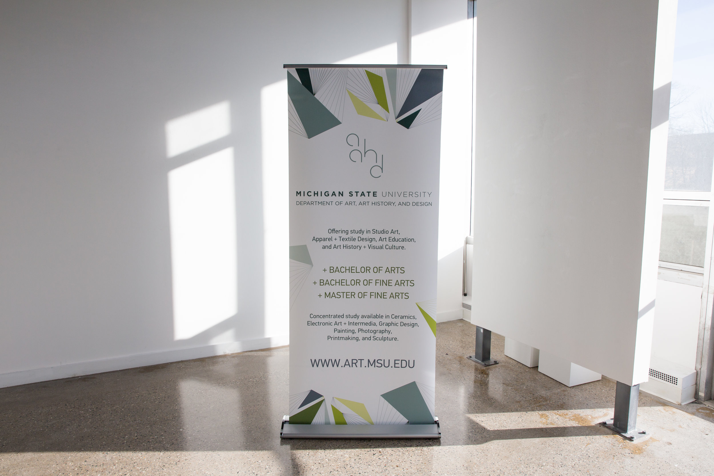 As the graphic design intern for The Department of Art, Art History, and Design at Michigan State University I created this pull up banner used for recruiting events. The goal was to create an informative and eye catching piece to attract students to our booth.
