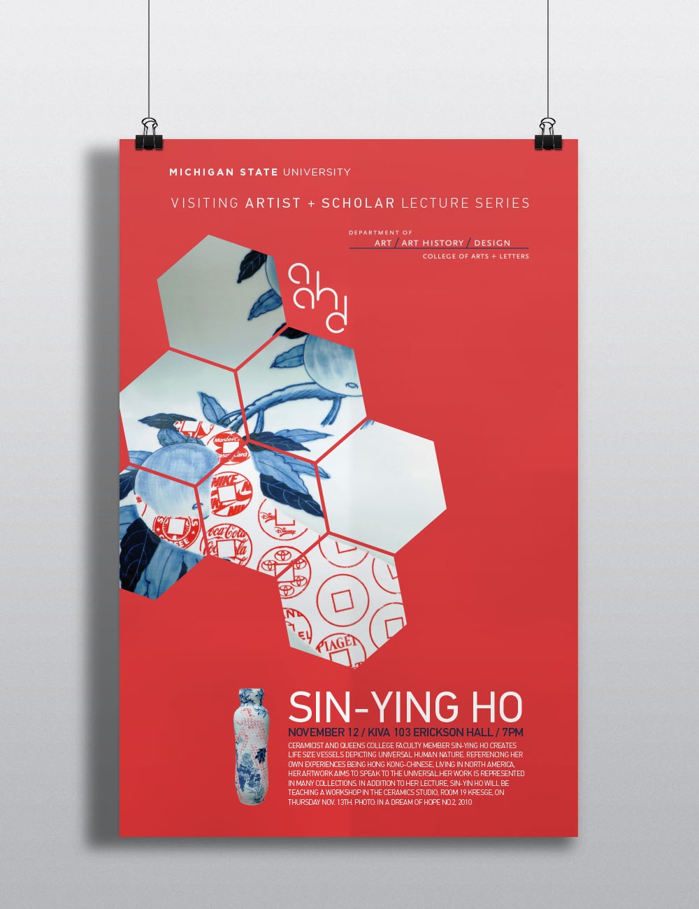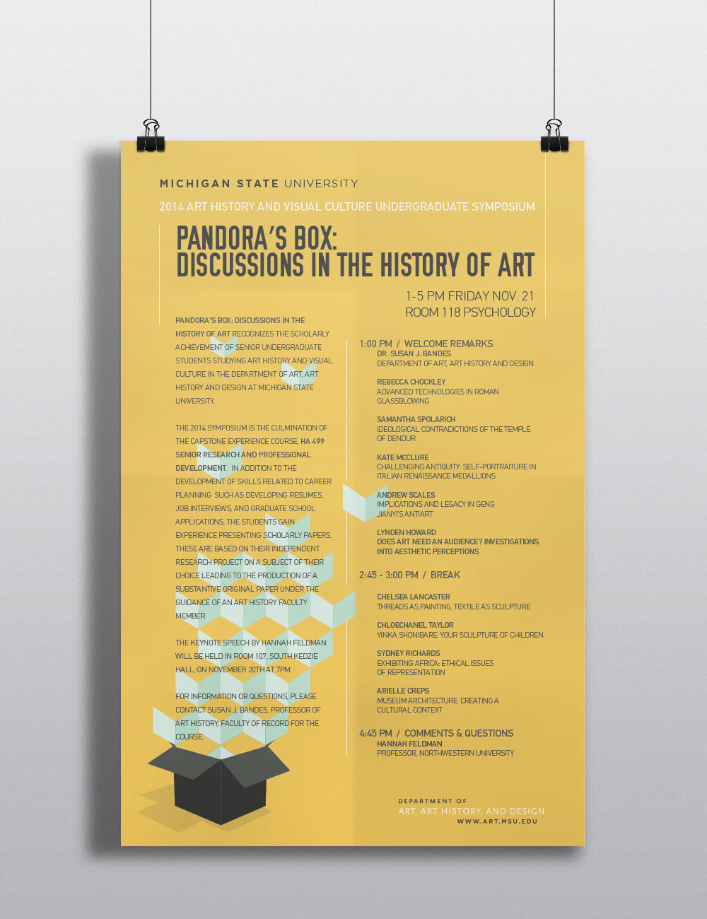 As the graphic design intern for The Department of Art, Art History, and Design at Michigan State University I was also responsible for designing posters for each artist that visited campus for the Visiting Artist + Scholar Lecture Series and for designing posters for other events happening in the department including the one below; Pandora's Box.