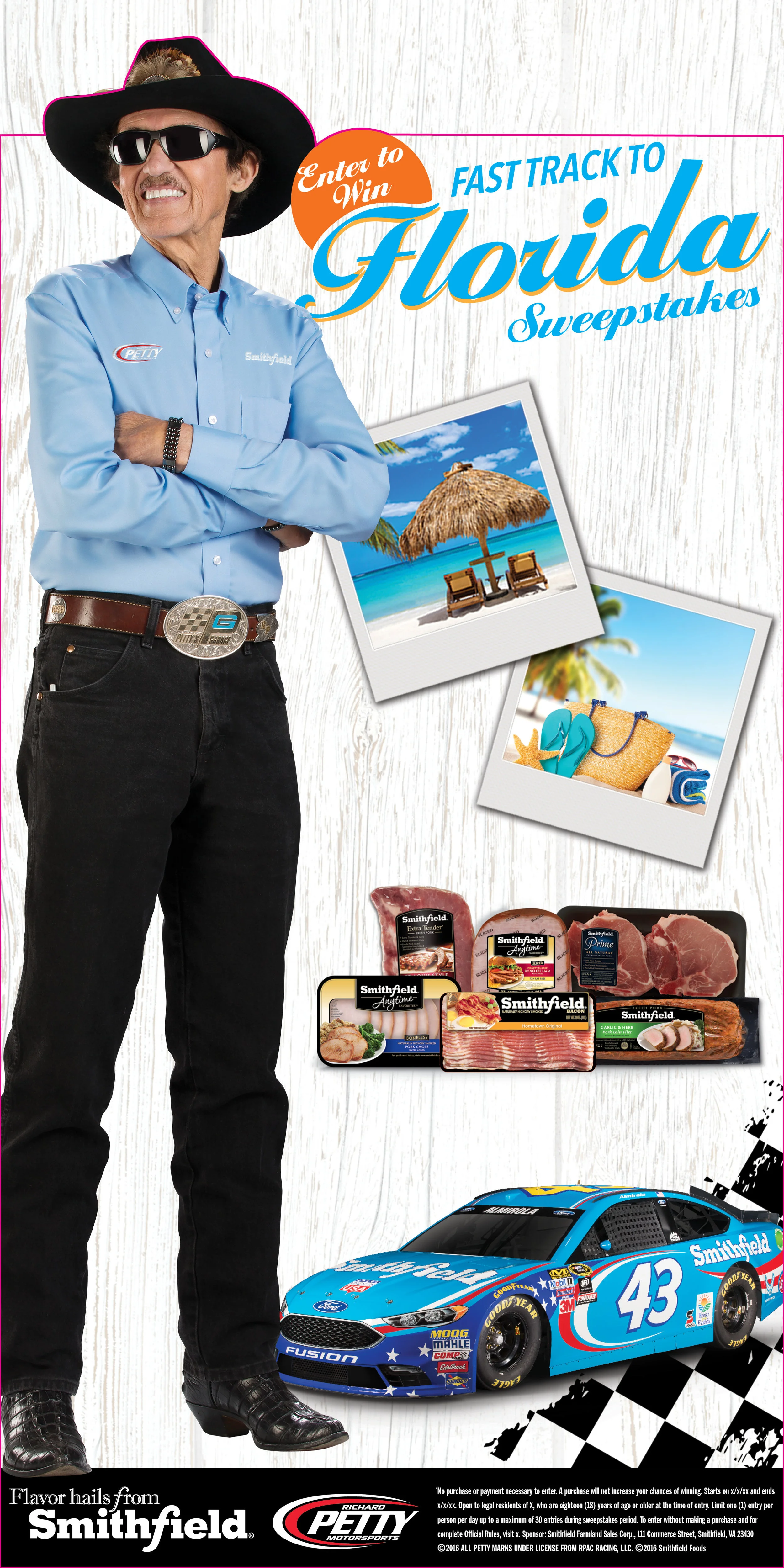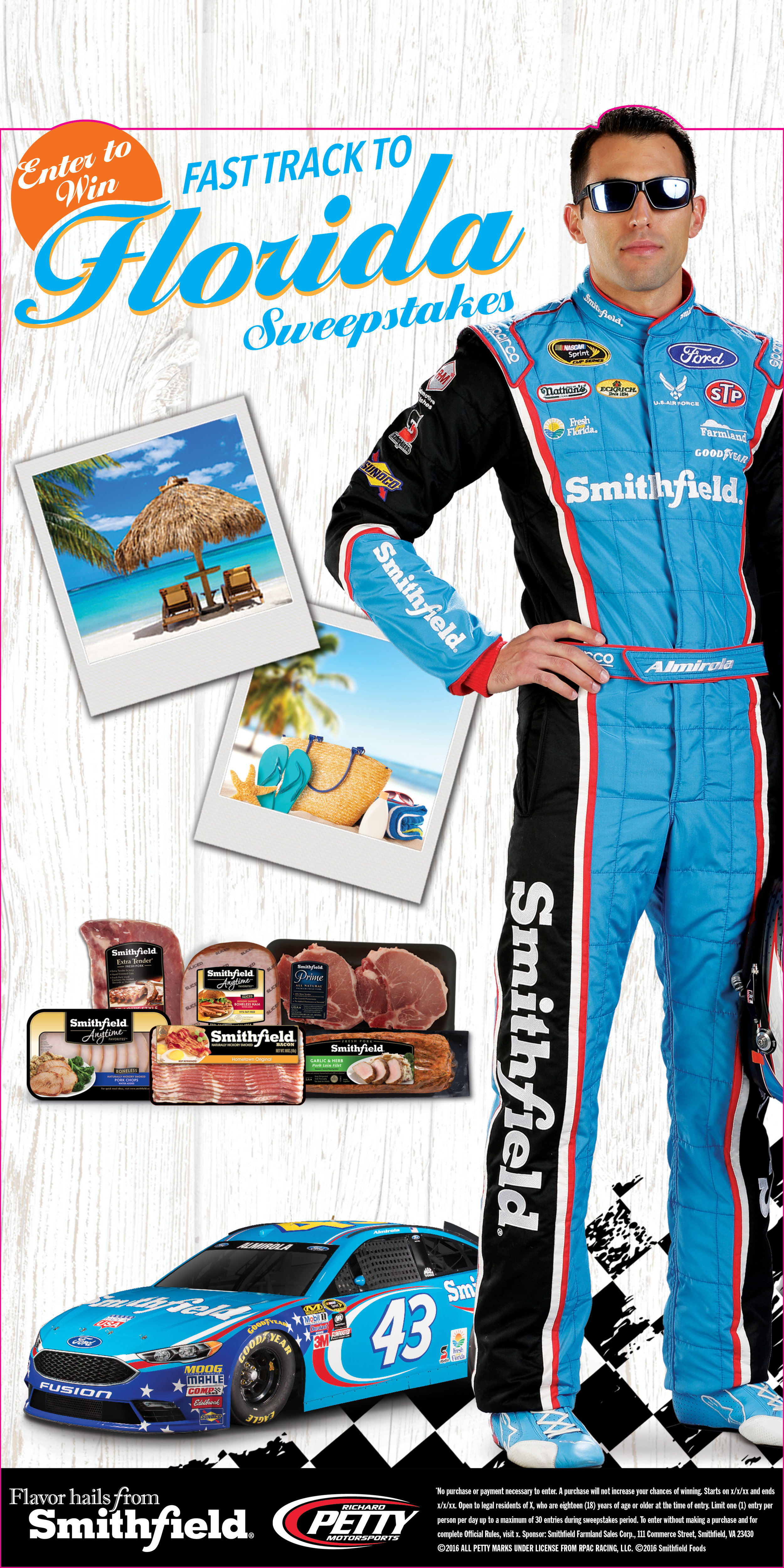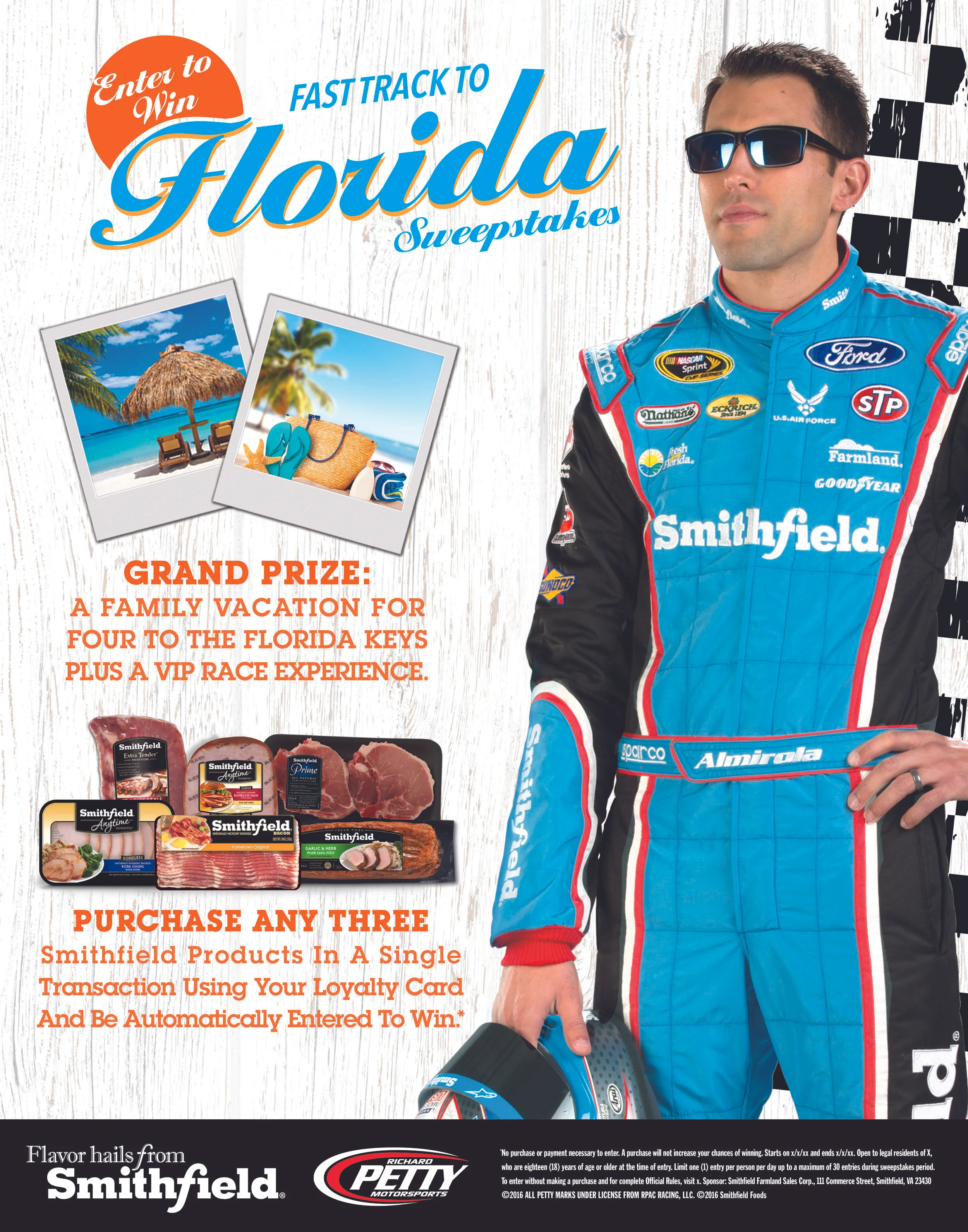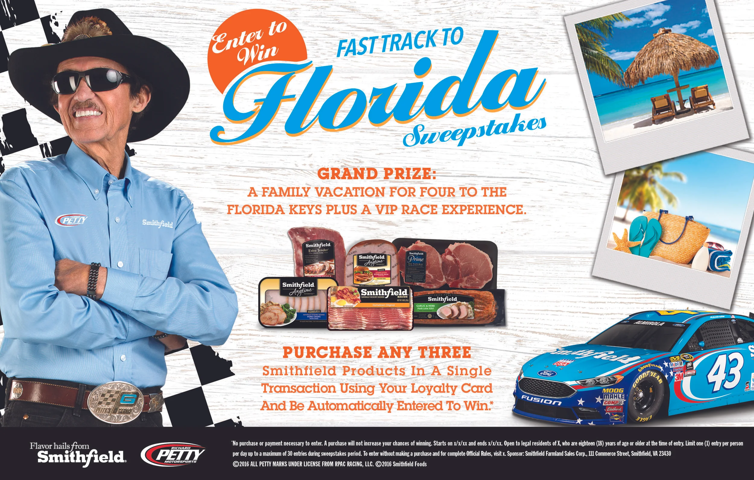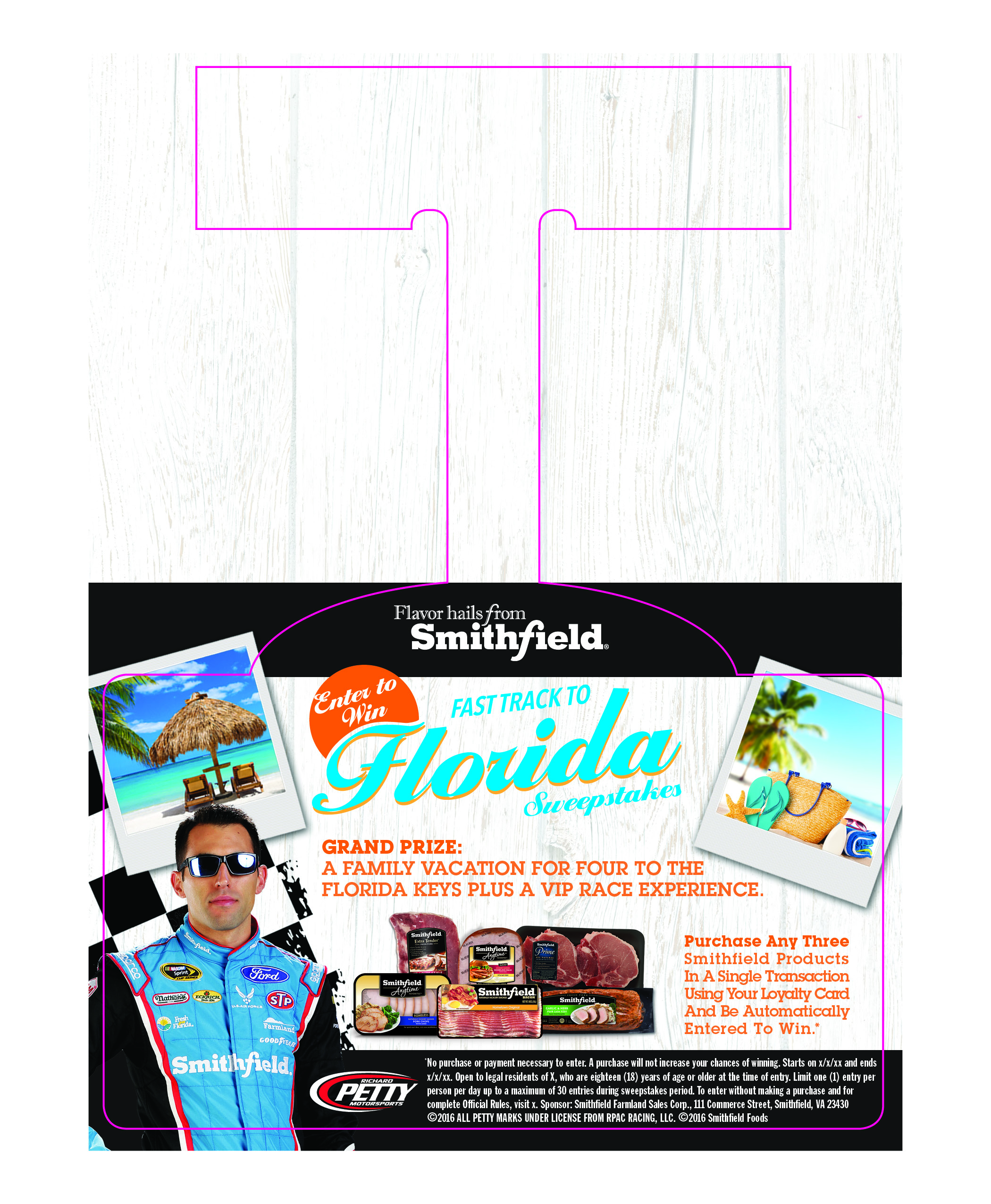 I created the look & feel for the Smithfield in-store sweepstakes program Fast Track to Florida supporting the Smithfield NASCAR sponsorship. The Fast Track to Florida Sweepstakes gives shoppers the opportunity to win a family vacation to the Florida Keys, plus a VIP Race Day Experience at Daytona. We created several in-store pieces including a Standee, Iron Man Sign, a Dangler, and a Meat Case Sign. *Note that the pink line is my dieline*